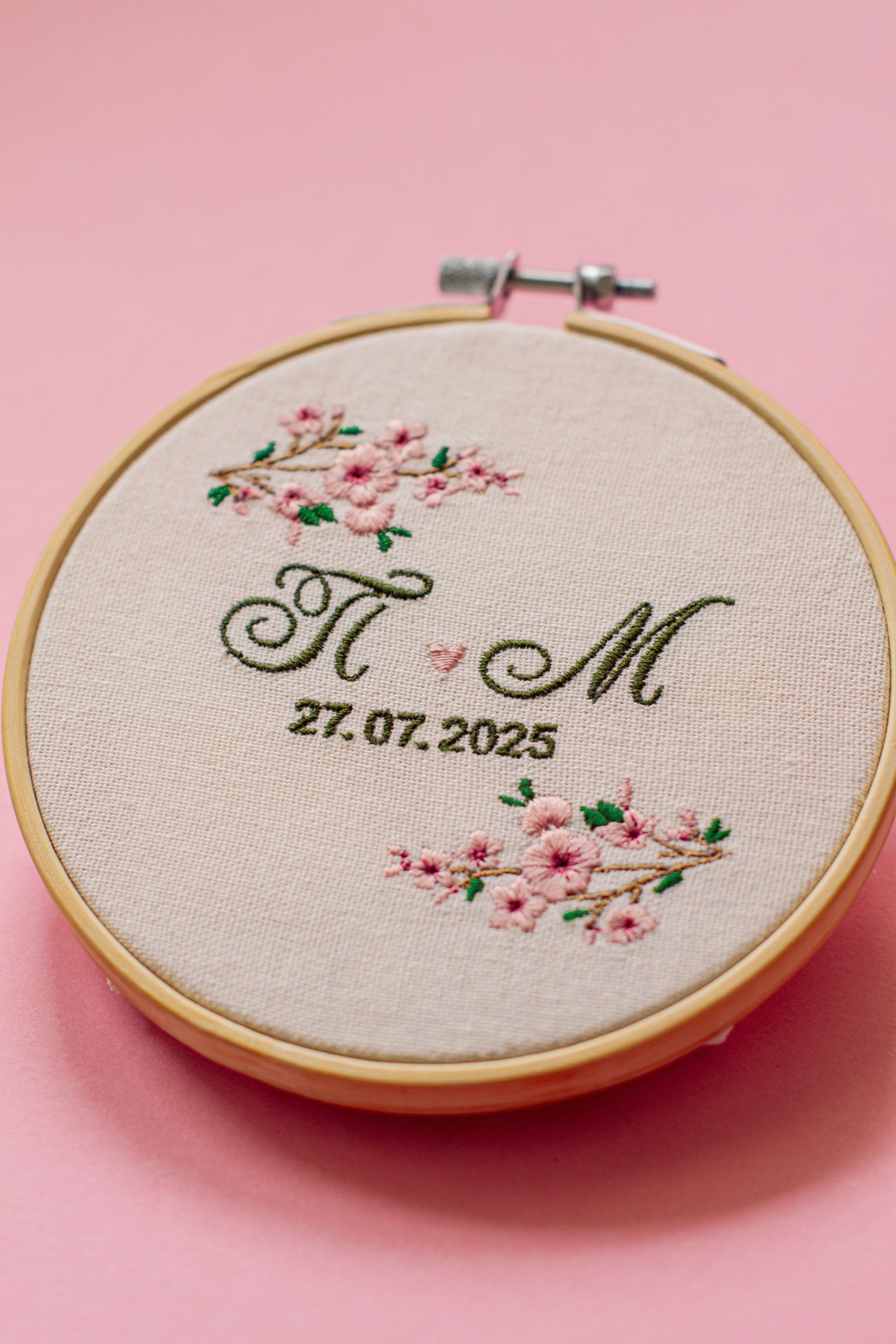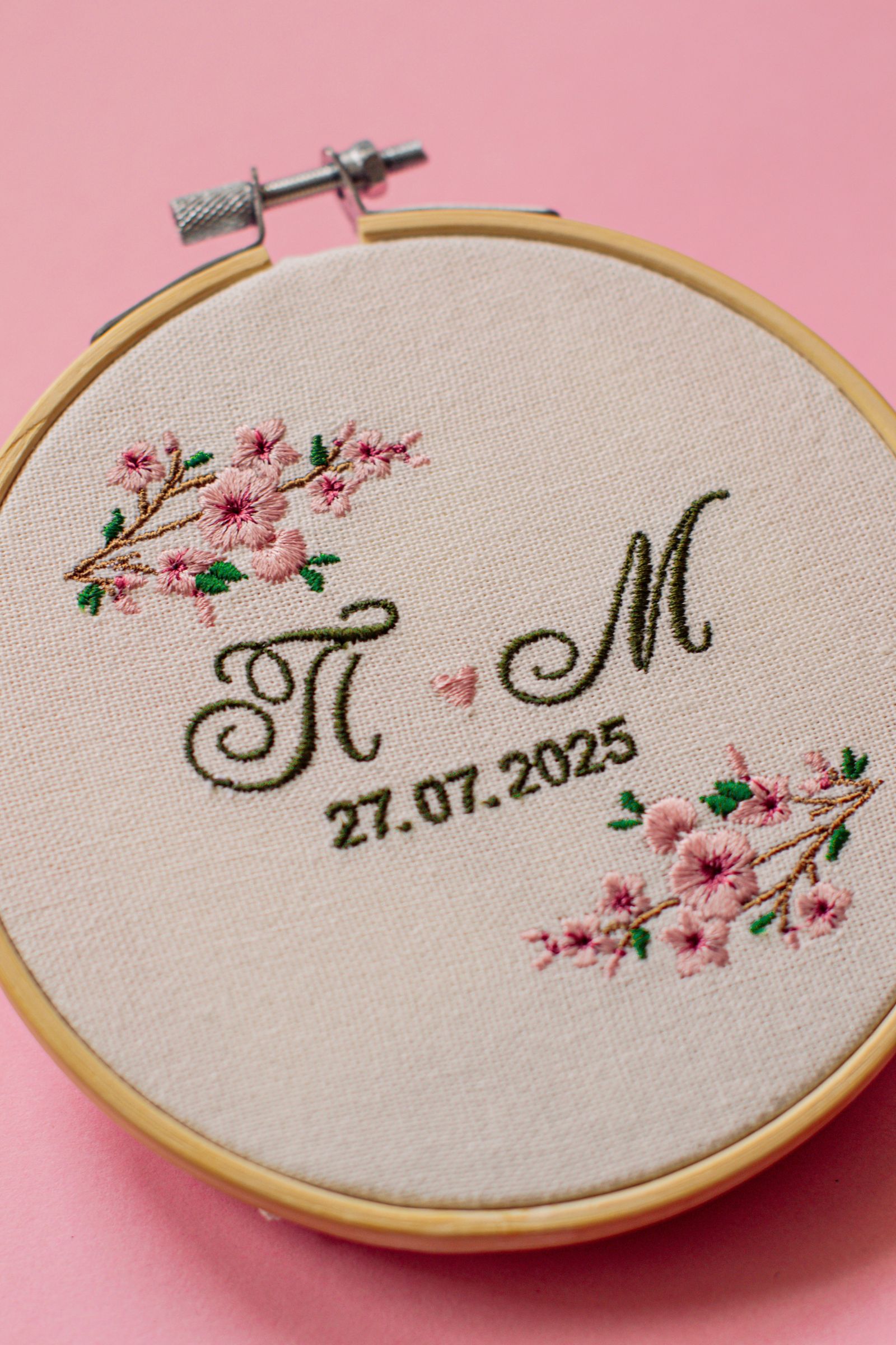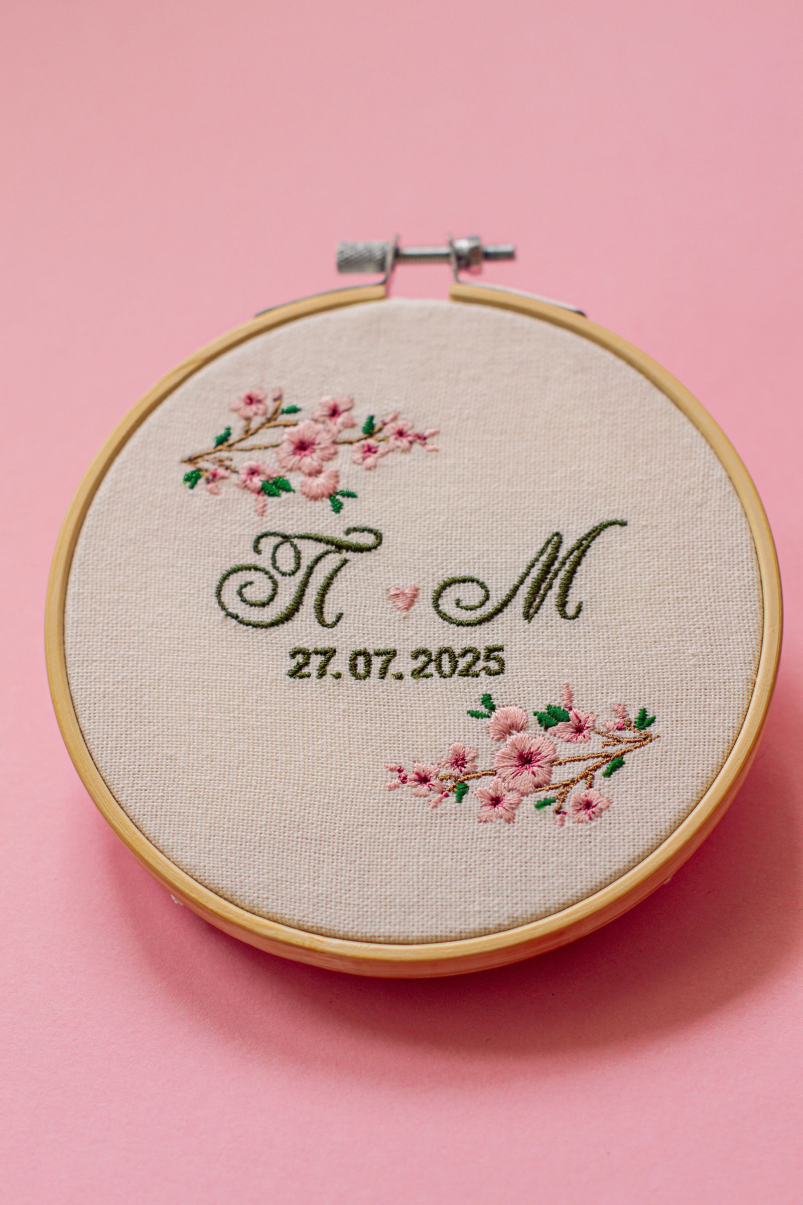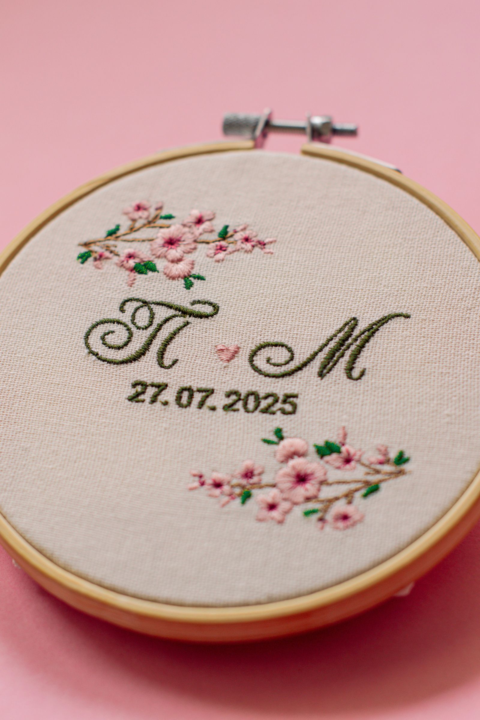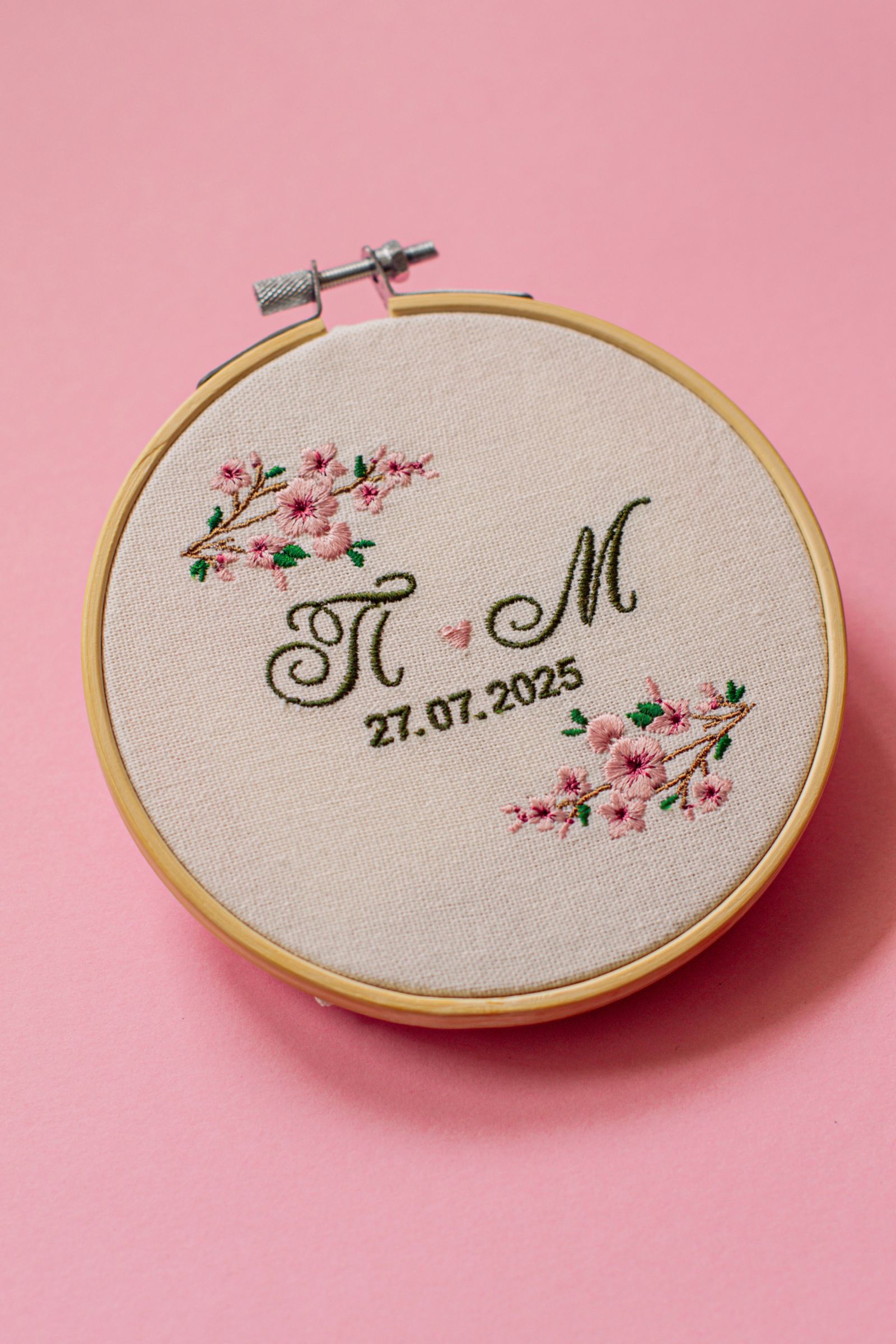 Вариант на мини бродирана сватбена картина с инициали на младоженците и дата, изработена като малък подарък за всеки гост. При заявяване на по-голяма бройка, може да се направи намаление и да се предложи изгодна групова цена.