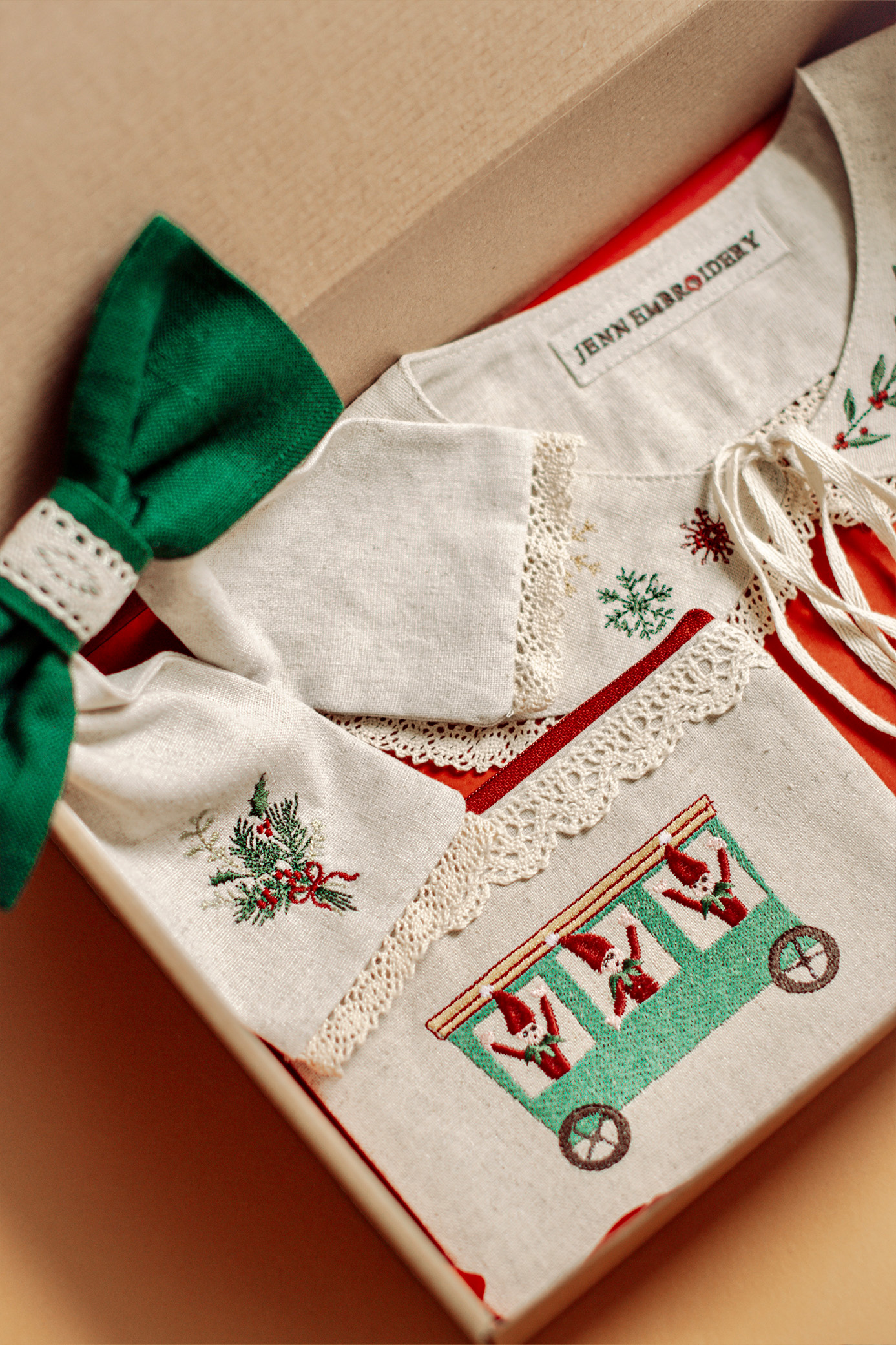 Всяка кутия включва уютна зимна якичка, мини несесер/портмоне с цип, бродирана коледна украса за елха и празнична панделка за коса – всичко изработено с любов и внимание към всеки детайл.