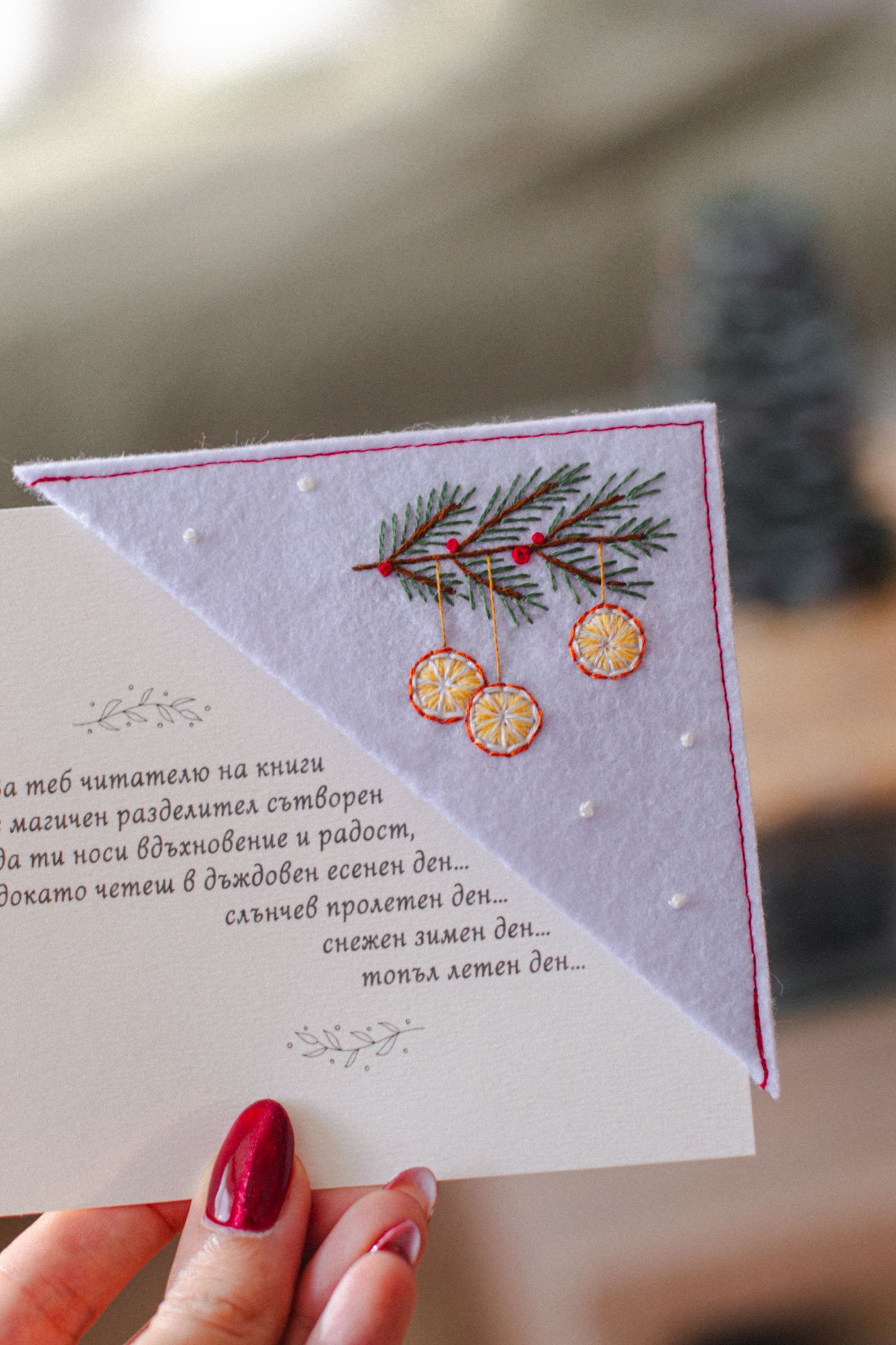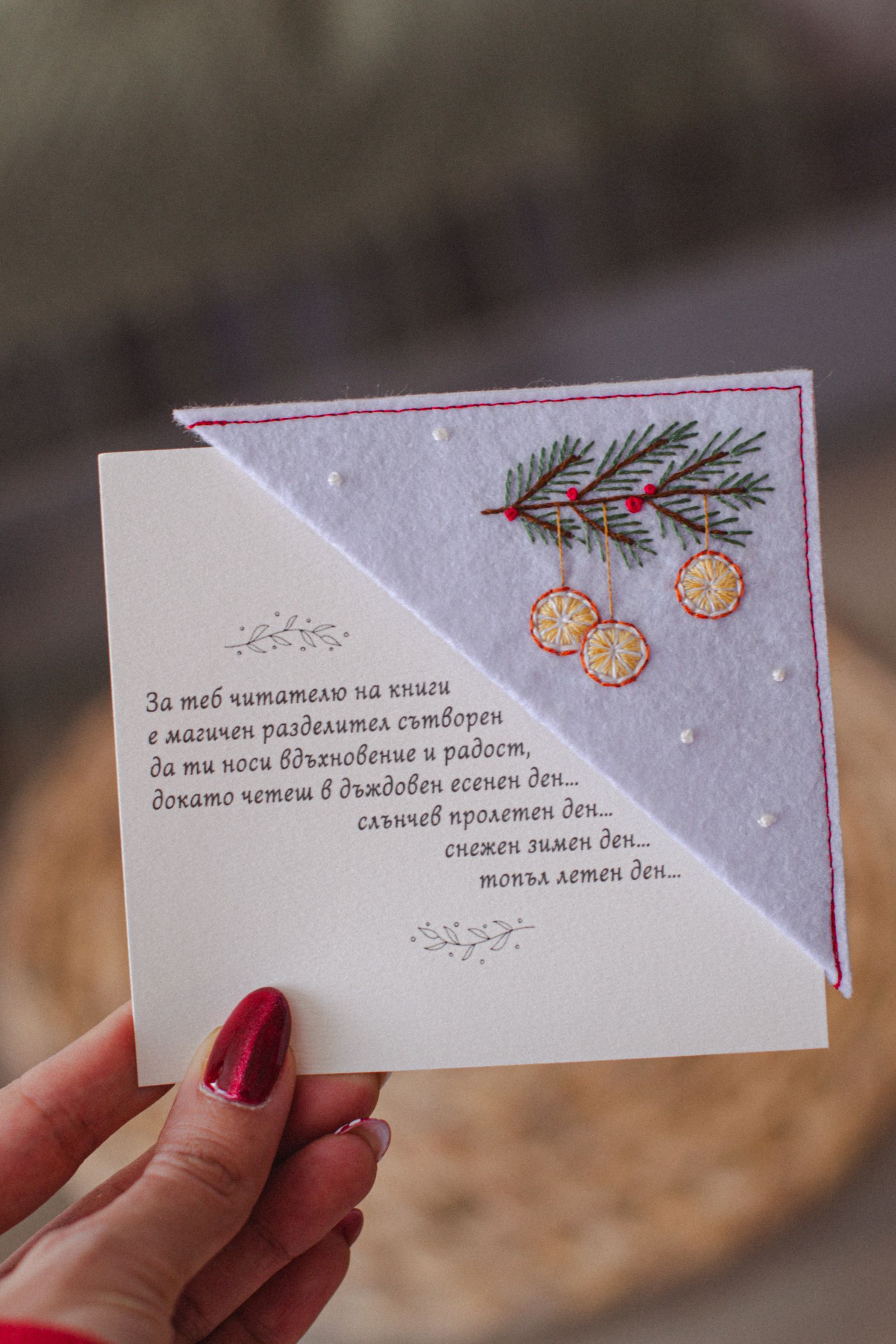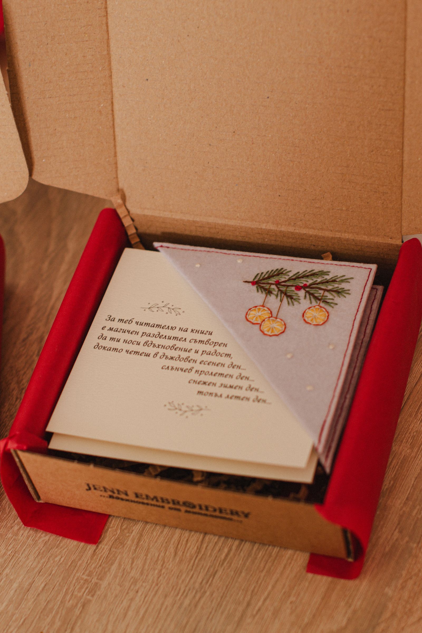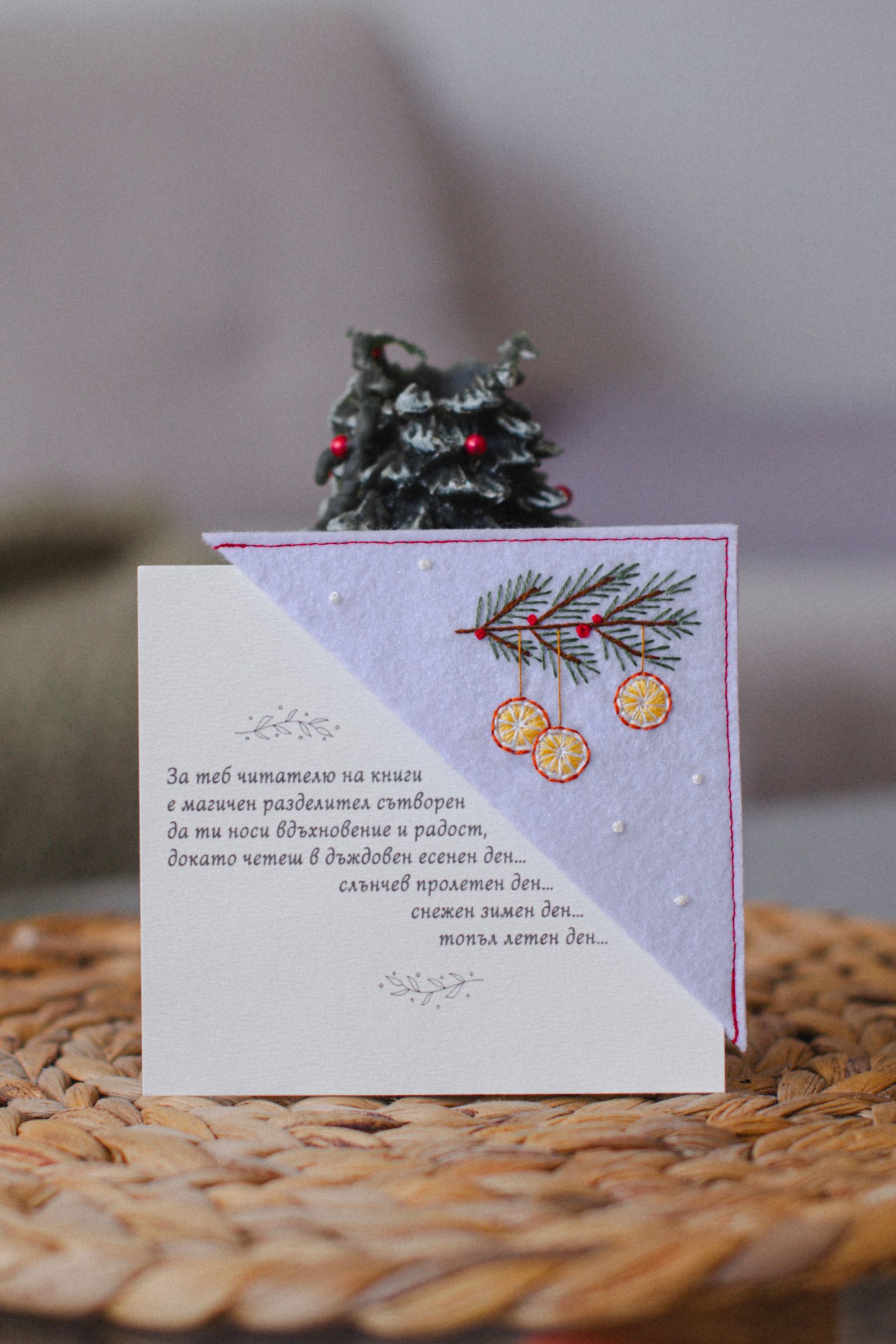 Ръчно изработен книгоразделител от филц с бродирани портокалови резенчета и елхово клонче. Носи усещане за домашна Коледа, аромат на цитрус и зимна топлина – нежно допълнение към всяка книга и прекрасен подарък за читател, който обича празничната магия.