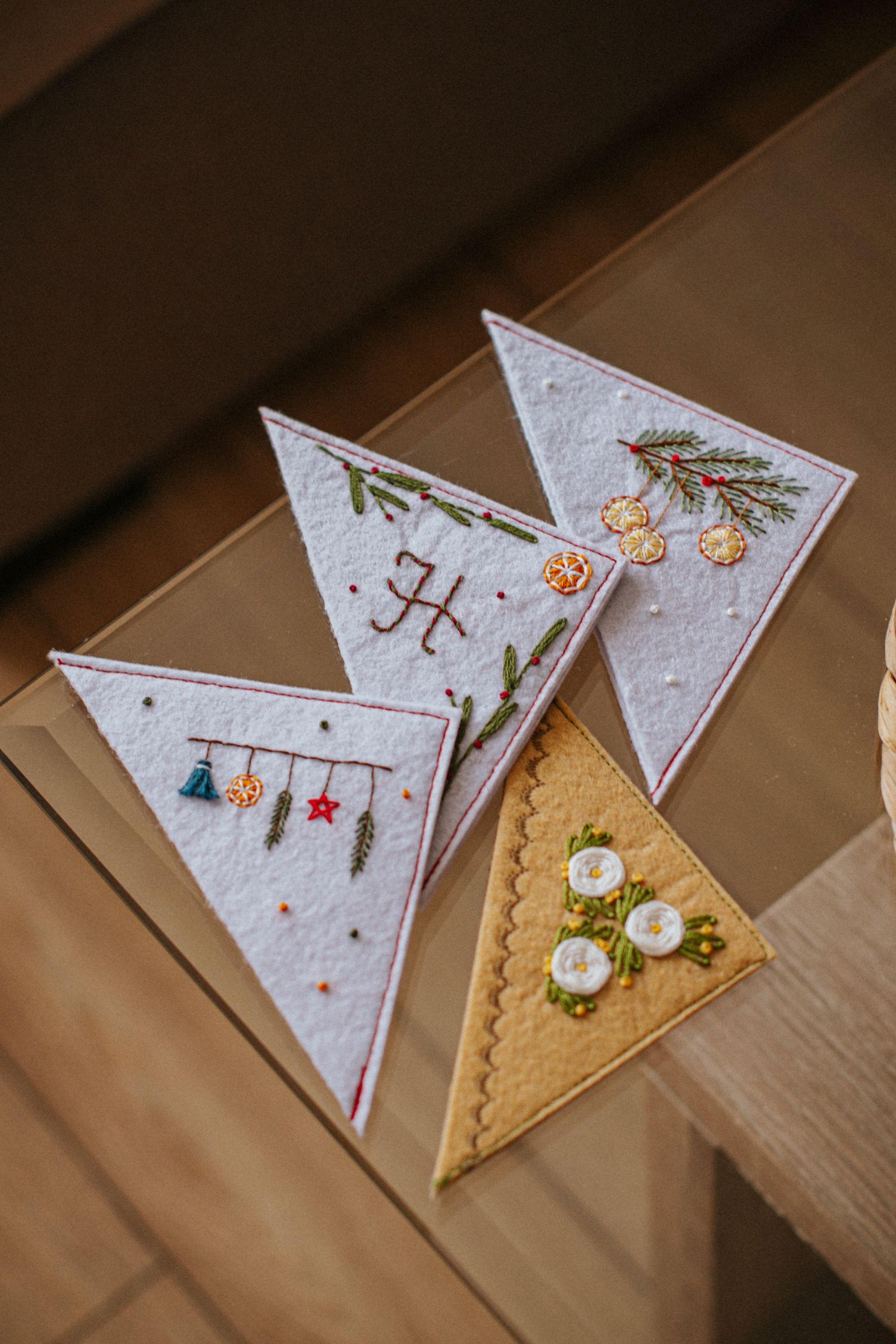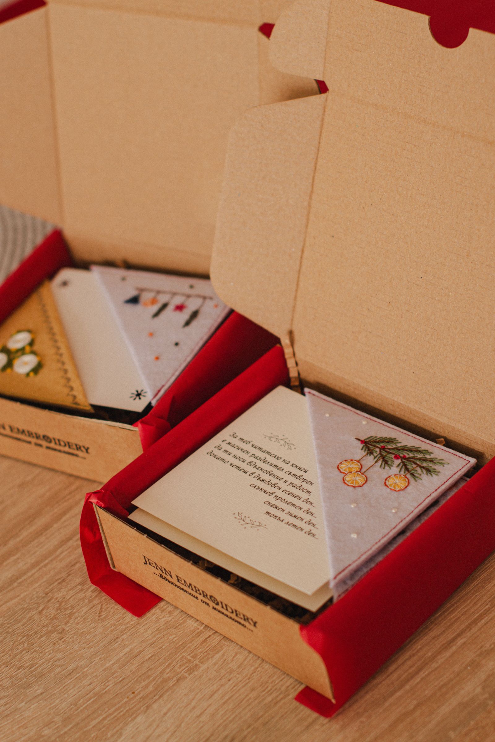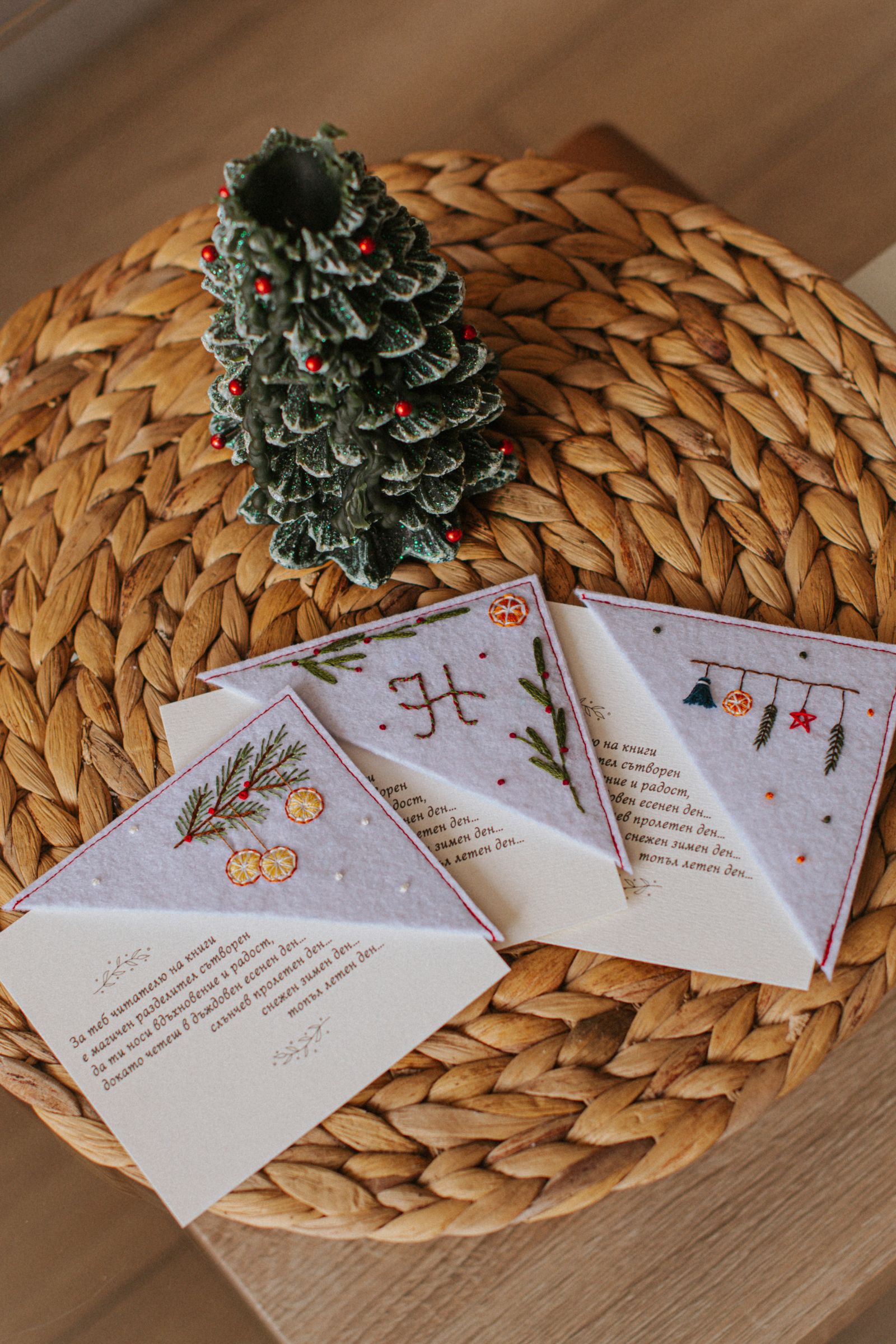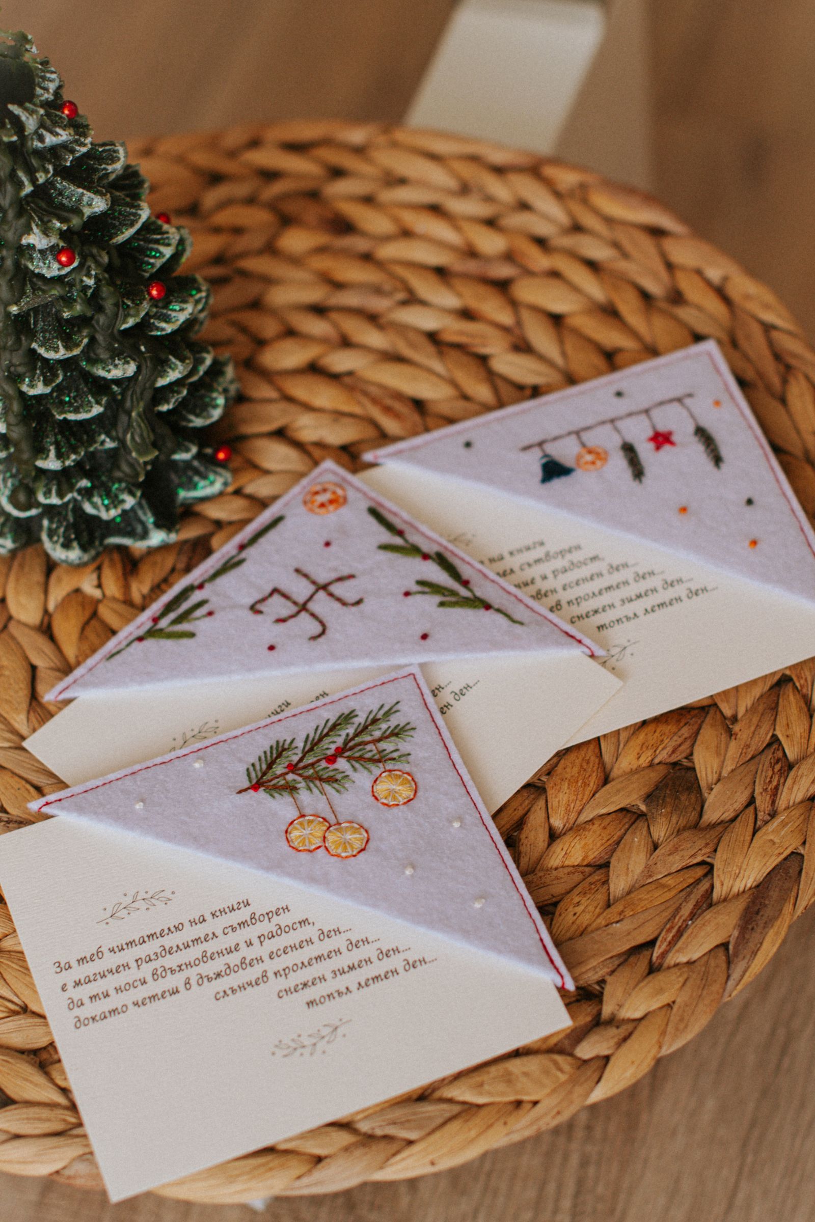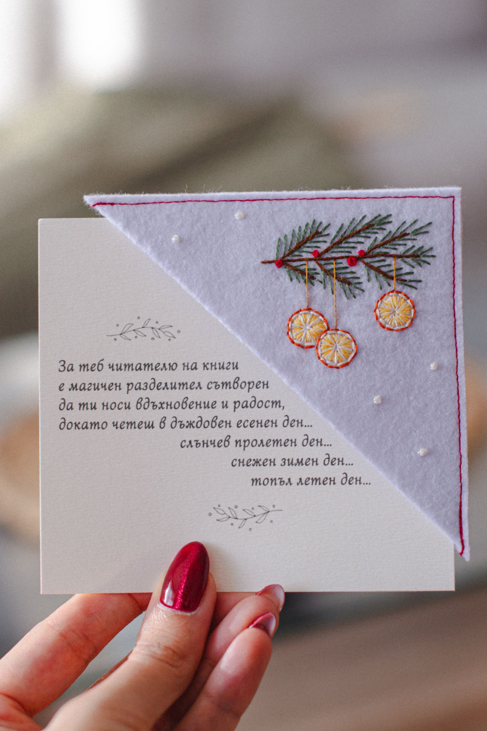 Ръчно изработен книгоразделител от филц с бродирани портокалови резенчета и елхово клонче. Носи усещане за домашна Коледа, аромат на цитрус и зимна топлина – нежно допълнение към всяка книга и прекрасен подарък за читател, който обича празничната магия.